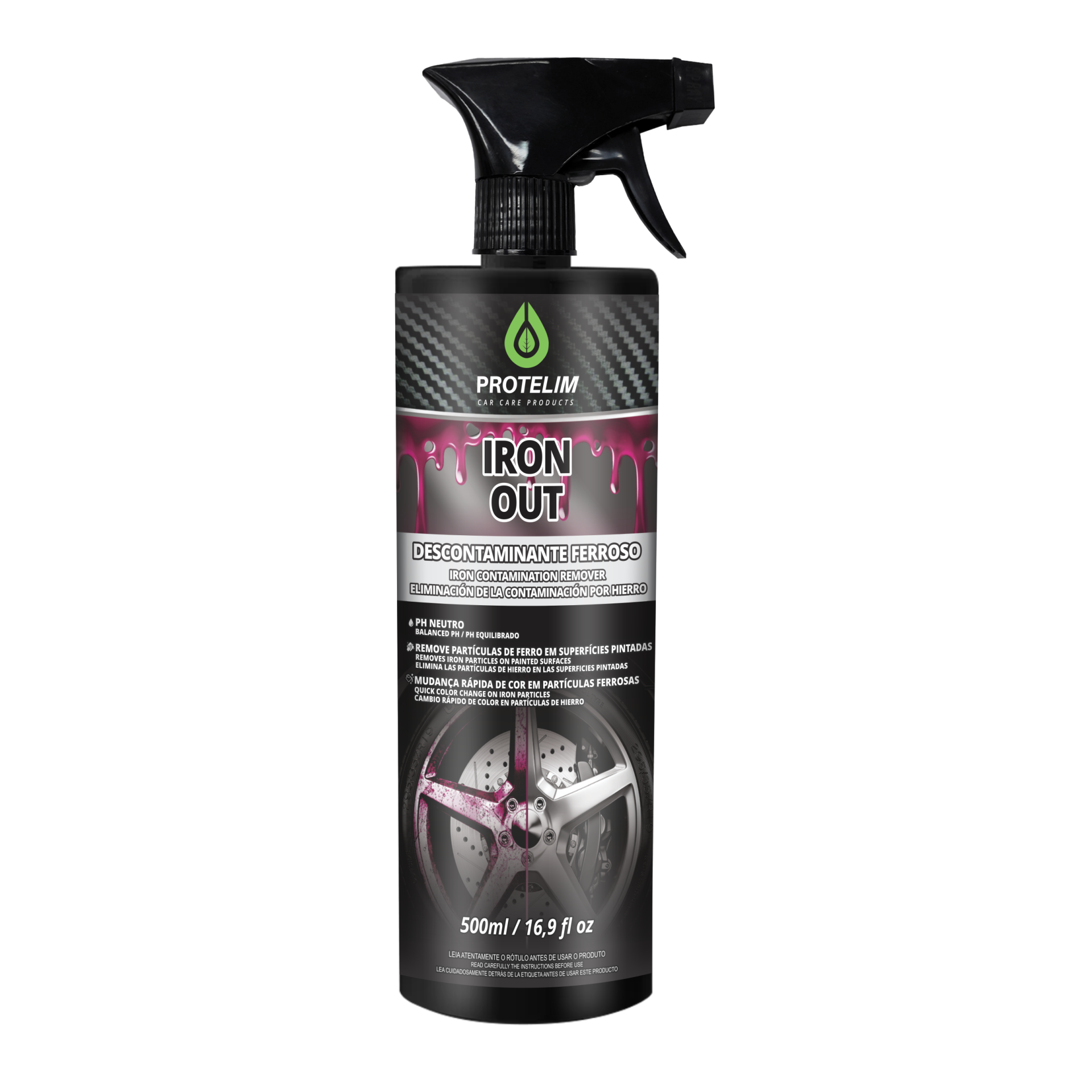 IRON OUT es un descontaminante ferroso de alta tecnología, indicado para remover y descontaminar hollín y partículas de frenos oxidados. El producto tiene una acción profunda, actuando en las capas bajas de diferentes superficies como: llantas, cristales, carrocería, barniz, pinzas de freno, motores y piezas metálicas. Con su altísimo poder de limpieza, actúa en profundidad para eliminar las manchas más difíciles, transformándolas en componentes solubles. IRON OUT tiene un pH neutro y puede utilizarse en una gran variedad de superficies para eliminar partículas ferrosas.