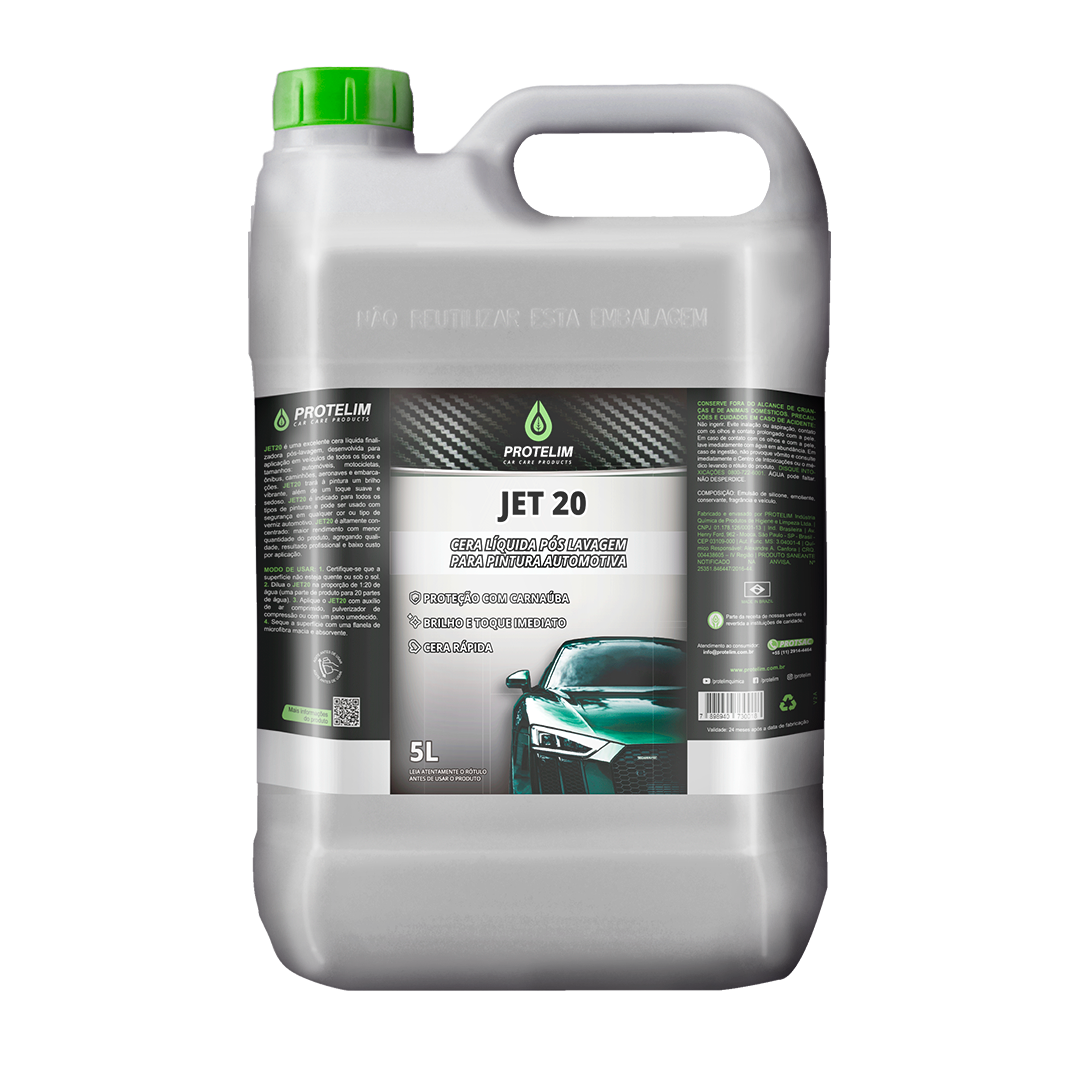 PROT JET 20 é um finalizador que foi desenvolvido para aplicação após a lavagem de automóveis, motos, ônibus, caminhões, aeronaves e barcos, dando brilho e toque suave na superfície, além de proteger contra agentes do tempo. Essa cera automotiva protetora é indicada para todos os tipos de pinturas. Não aplicar o produto com a superfície quente ou sob a luz do sol.